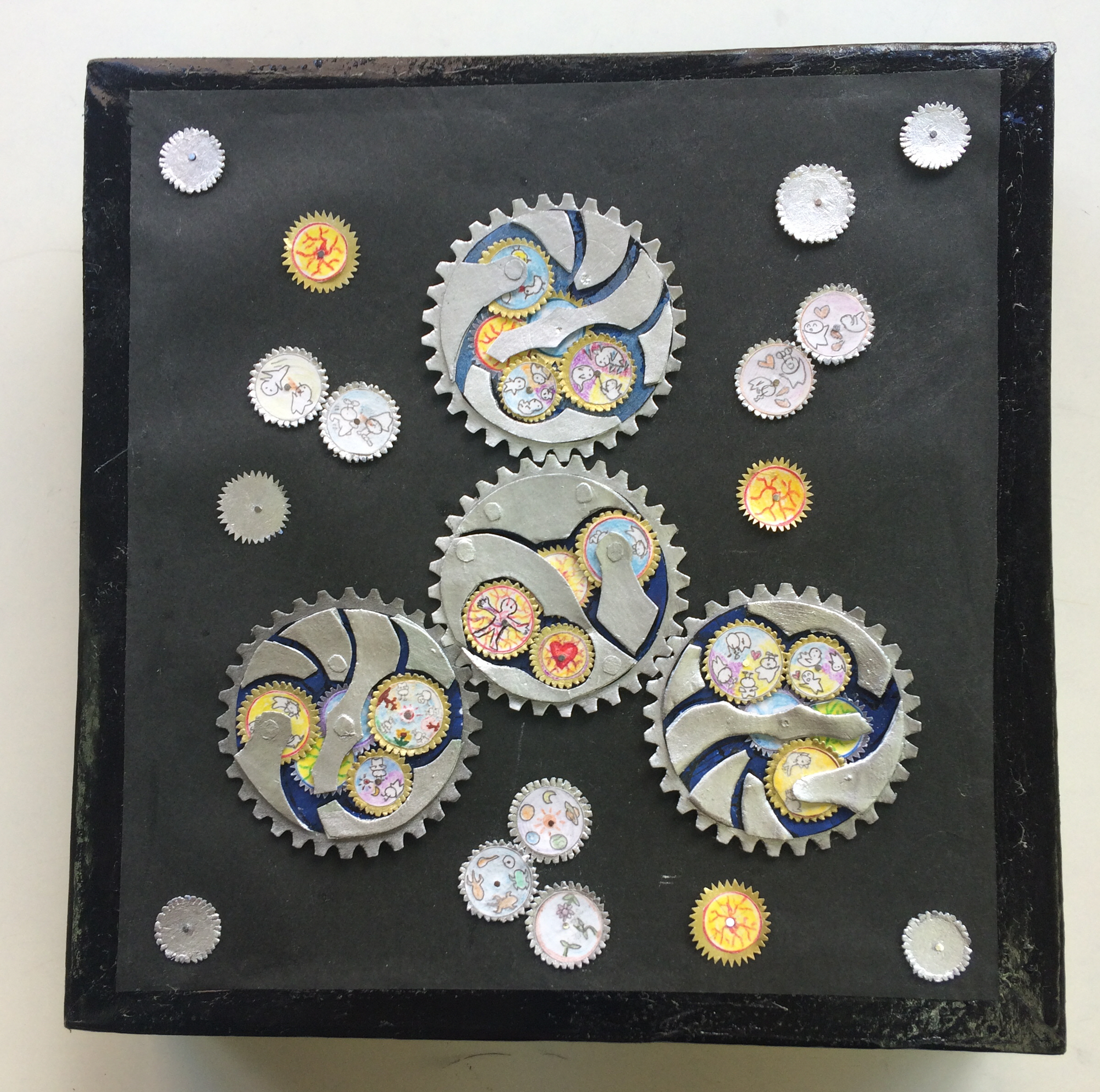 画用紙をチョキチョキ切って歯車を作っていって中心をピンで仮止めをしました。 最初は下の3つの時計のように「ただ無機質なメカ」を作るつもりだったのですが、 中に組み込まれた「小さな歯車に絵を描いたら」と思ったら もっと広がりのある世界が描けるんじゃなかなと思い試しに描いたのが上の3つです。 |